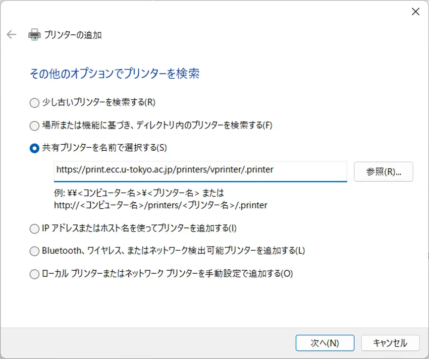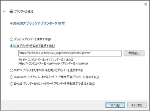 4. 「その他のオプションでプリンターを検索」画面が開きます.「共有プリンターを名前で選択する(S)」をチェックし,直下のフォームにhttps://print.ecc.u-tokyo.ac.jp/printers/vprinter/.printerを入力して,「次へ」ボタンを押してください.