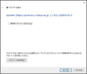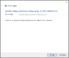 10. インストールが完了すると,「プリンターの追加」画面に戻ります.「vprinter (https://print.ecc.u-tokyo.ac.jp 上)」と表示されていることを確認し,「次へ」ボタンを押してください.