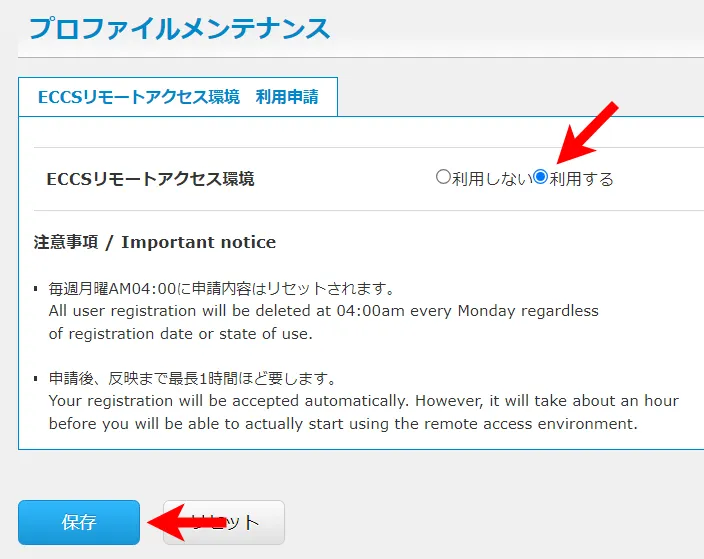 なお,利用状況や申請時期にかかわらず,毎週月曜日の午前4時にリモートアクセスユーザの登録は全て削除されます.継続して利用する場合は,再度申請が必要です.