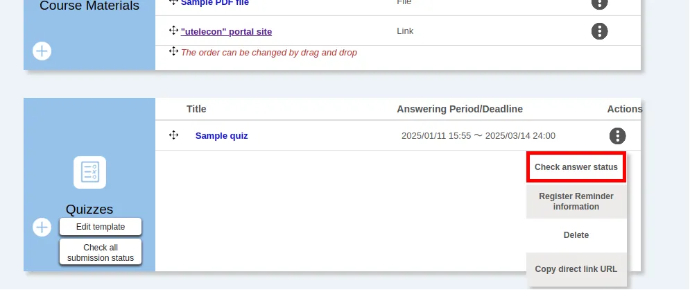 This function allows you to check the submission status of tests in the course as one unit for scoring purposes. To check the submission status of all tests, click on “Check all submission status” in the “Quizzes” section of the “Course Top” screen.