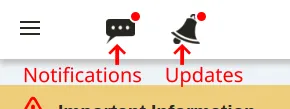When there are unread information or unread updates, the icon on the bar on the upper screen will have a red circled attached. When the icon is pressed, a box will open, and the unread notifications will appear.