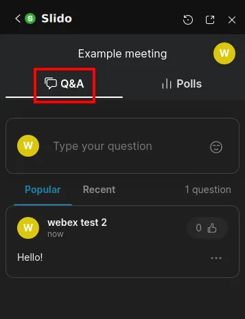 Click “Q&A” to send a question to the host, presenter, or (if you are using Webex Webinars) the panelist.