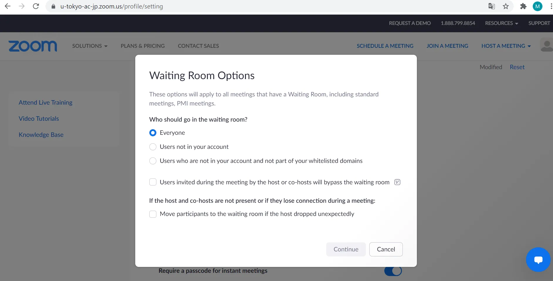 @utac.u-tokyo.ac.jp) will be automatically admitted to the meeting room without entering the Waiting Room. - ”Users who are not in your account and not part of your whitelisted domains”: Participants signing into Zoom with their UTokyo Account and participants signing in with email addresses of a specific domain will be automatically admitted to the meeting room without entering the Waiting Room. For online classes, it is recommended that you select this option and enter