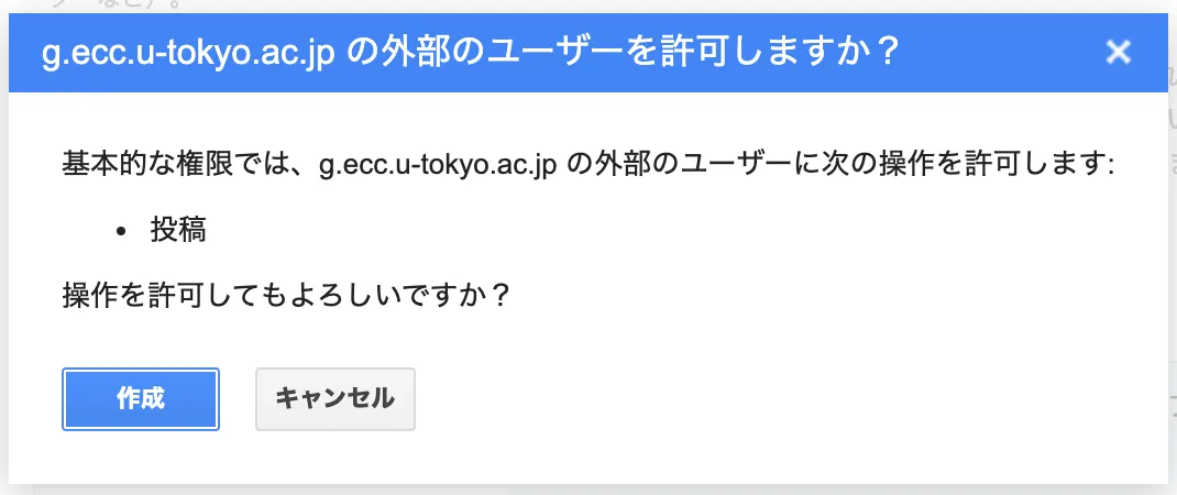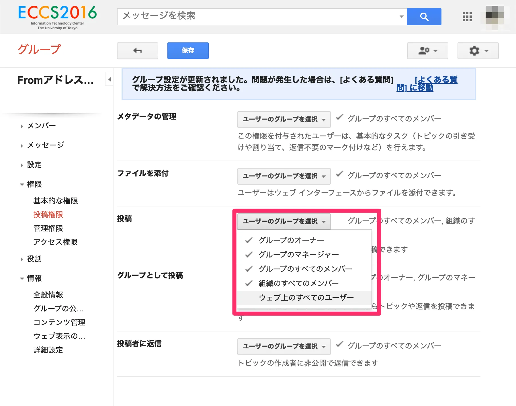• もし投稿権限を「ウェブ上のすべてのユーザー」にしなかった場合,この後の手順リスト6番で受け取るはずのメールが受け取れなくなってしまうため,この操作が必要です.手順リスト6番の操作が済んだら,投稿権限は自由に設定してかまいません.
