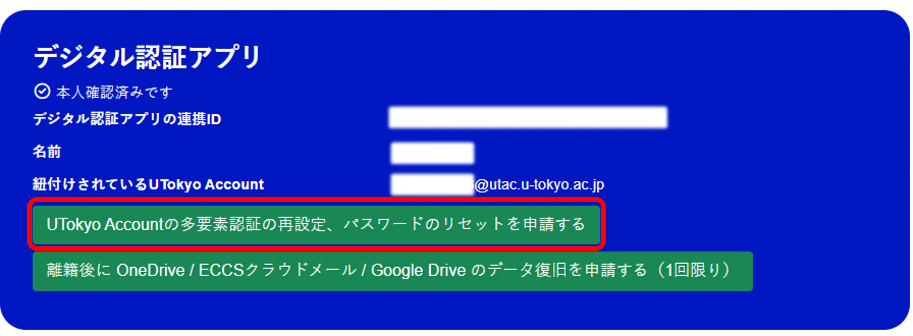 3. 「UTokyo Accountの多要素認証の再設定、パスワードのリセットを申請する」を押してください.