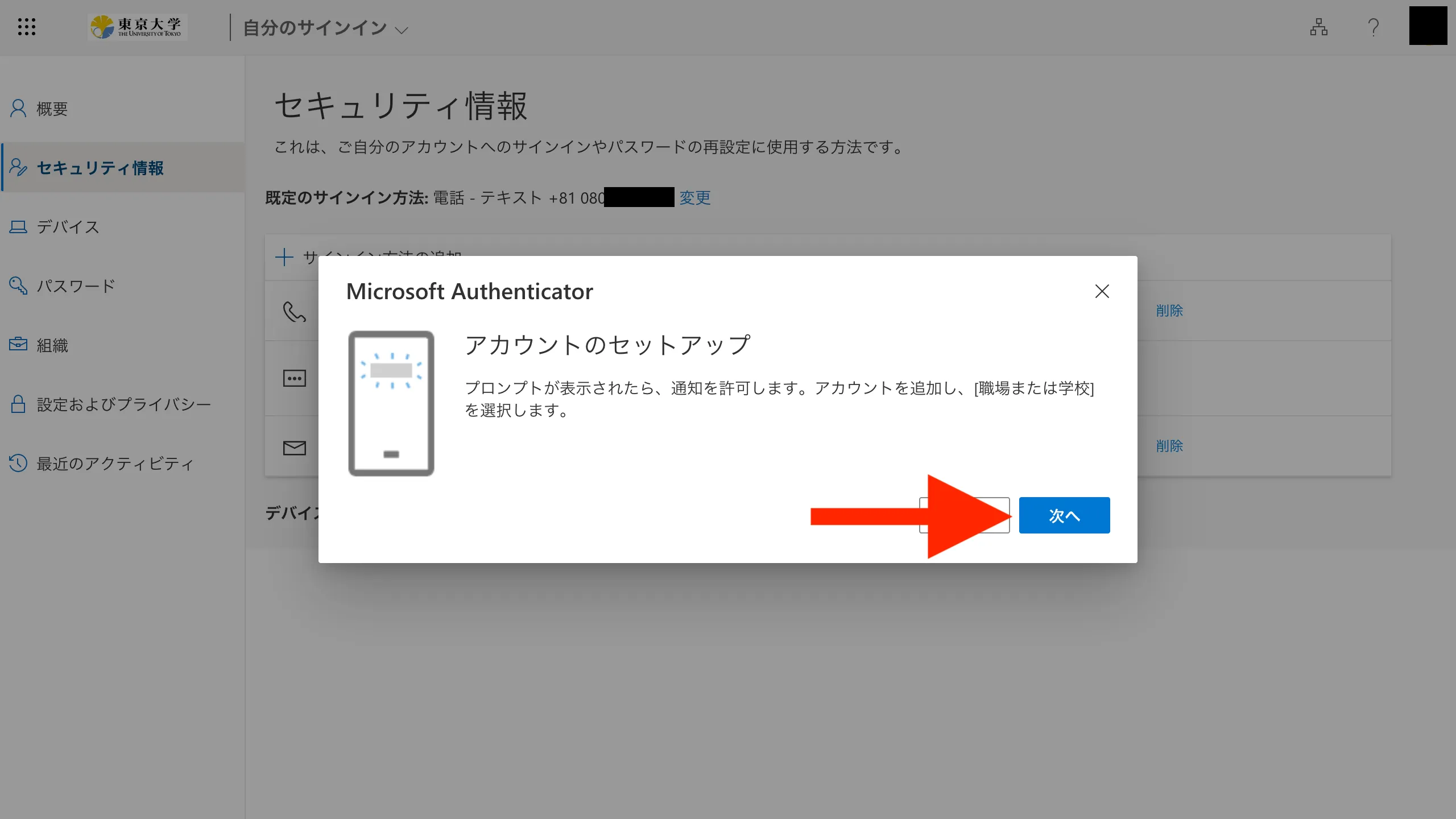 手順を終えると,その後UTokyo Accountにサインインする際,毎回,設定したSMSや専用のアプリなどで本人確認することが求められます.登録した本人確認方法(スマホのアプリや電話番号)が利用できない状態ではUTokyo Accountにサインインすることができなくなりますので,十分ご注意ください.