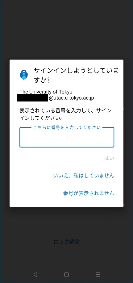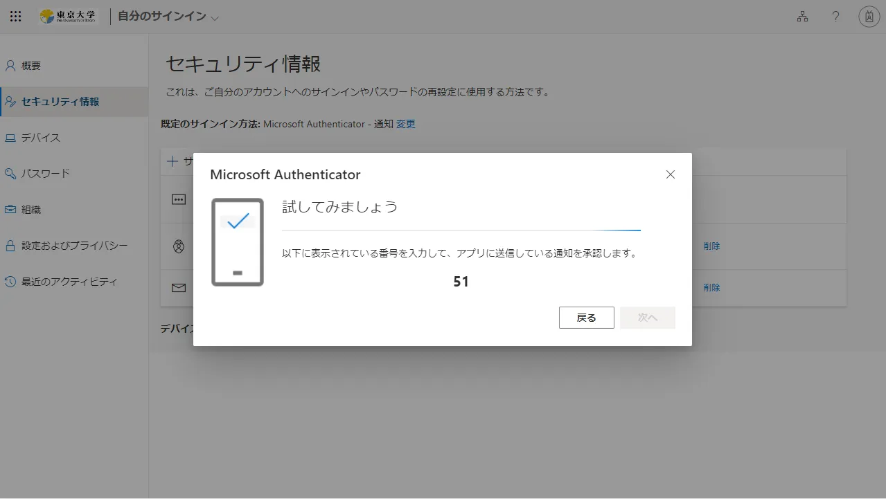 • Microsoft Authenticatorの場合:スマホに通知が送られ,サインイン画面に表示されている2桁の数字を入力するように求められるので,そのようにしてください.