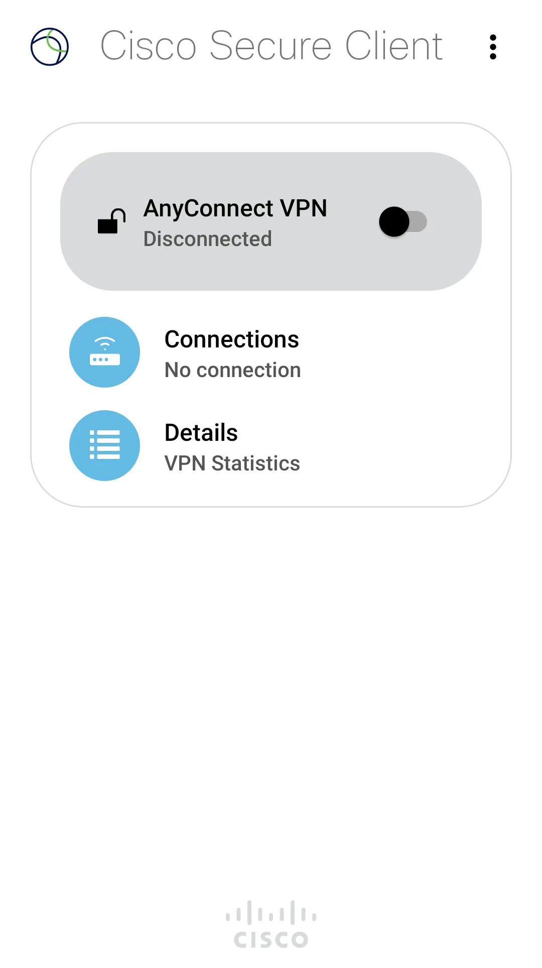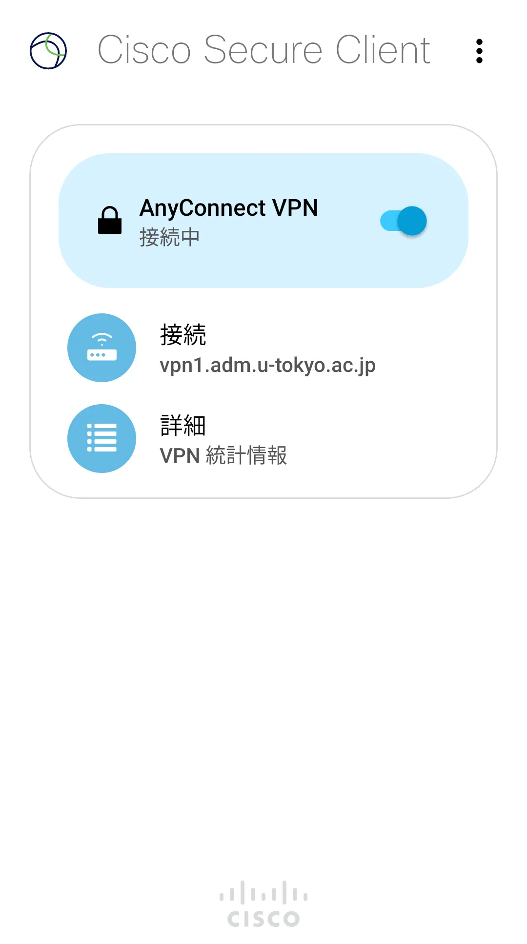 手順E: 下図のように「接続」に「vpn1.adm.u-tokyo.ac.jp」と記載されていることを確認してください.次に,「AnyConnect VPN」の横のトグルボタンをONにしてください.UTokyo Accountの認証画面が表示されたら,ご自身のUTokyo Accountでサインインしてください.前回のアクセスから時間をおかずに起動した場合は,この画面が表示されないで直ちにVPN接続が開始されることもあります.