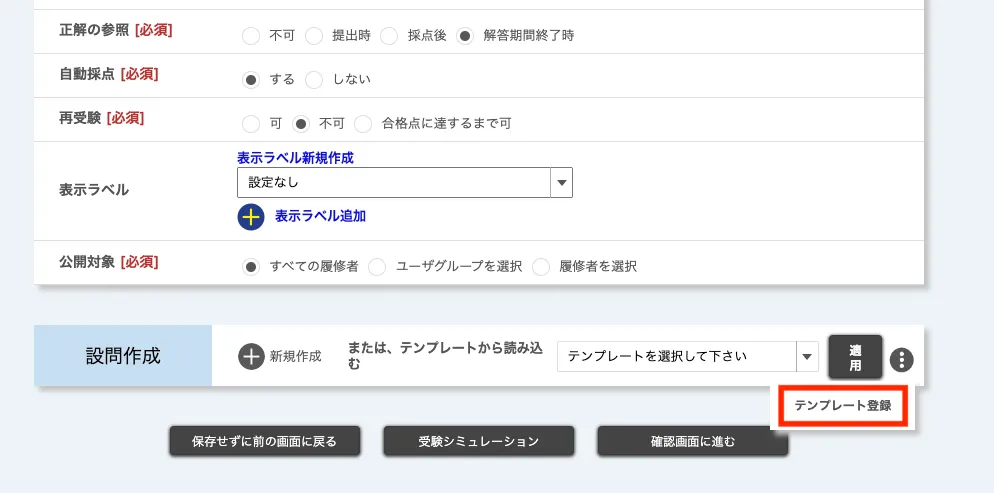 なお,テンプレートとして保存される設定項目は,テストのタイトル(テンプレートのタイトルとして保存されます)と各設問のみです.