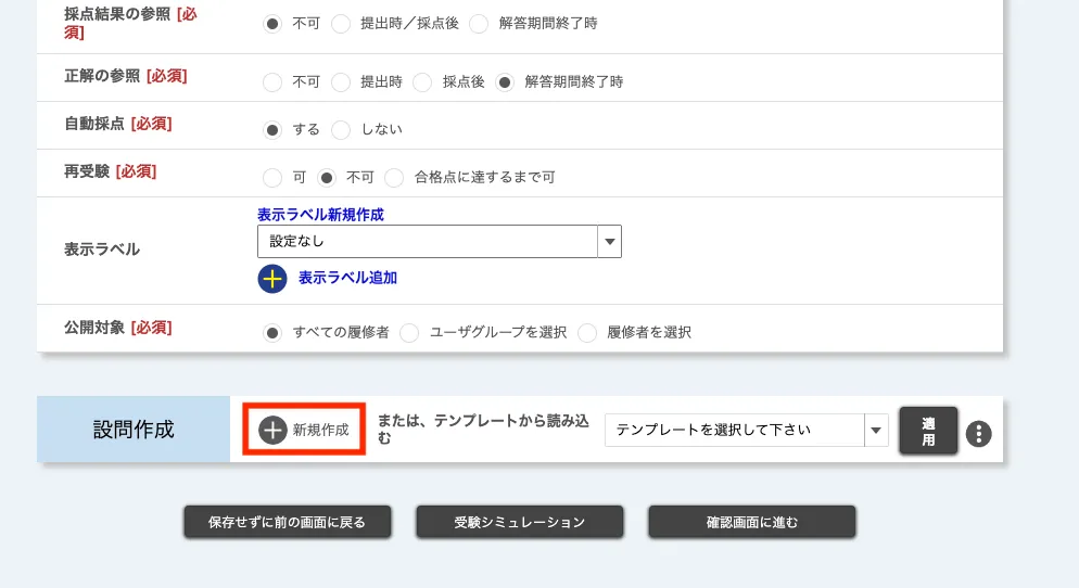 続いて,「新規登録」画面の下部にある「設問作成」欄で「新規作成」を押してください.設問の「新規登録」画面が表示されます.