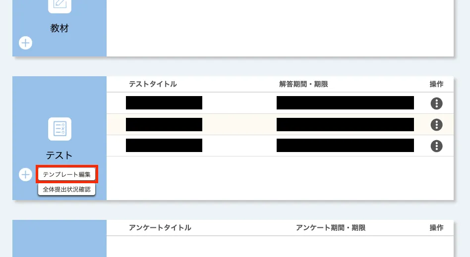 既に作成したテストを編集するには,「コーストップ」画面の「テスト」欄で対象のテストのタイトルを押してください.新規登録時と同様の画面である「編集」画面が表示されます.