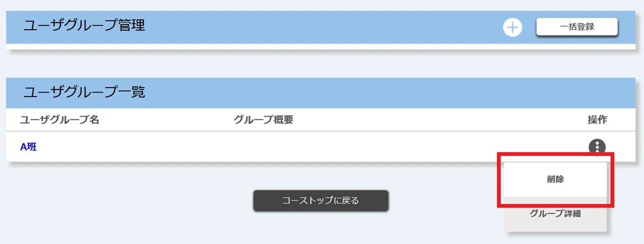 3. 「ユーザグループ一覧」のうち,削除したいものの「操作」メニューを開き,「削除」を押してください.