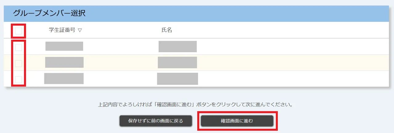 5. ユーザグループのメンバーとする履修者のチェックボックスをすべて選択し,「確認画面に進む」を押してください.(「グループメンバー選択」の真下にあるチェックボックスを選択すると,表示されているすべての履修者を一度に選択できます.)