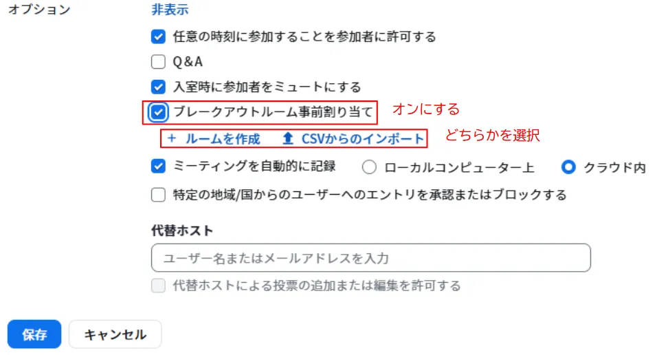 4. 「オプション」を表示を押すと,オプション一覧が表示されます.その中から「ブレイクアウトルーム事前割り当て」をオンにしてください.「ルームを作成」と「CSVからのインポート」に加えて,保存した割り当てが選択可能になります.