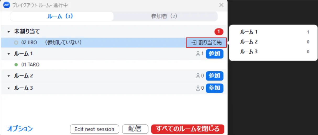 ブレイクアウトセッション開始後にミーティングに参加した人がいる場合,その人は「未割り当て」の状態でメインミーティングにとどまります.その人をいずれかのブレイクアウトルームに追加で割り当てるときは,個別に手動で割り当てる必要があります.